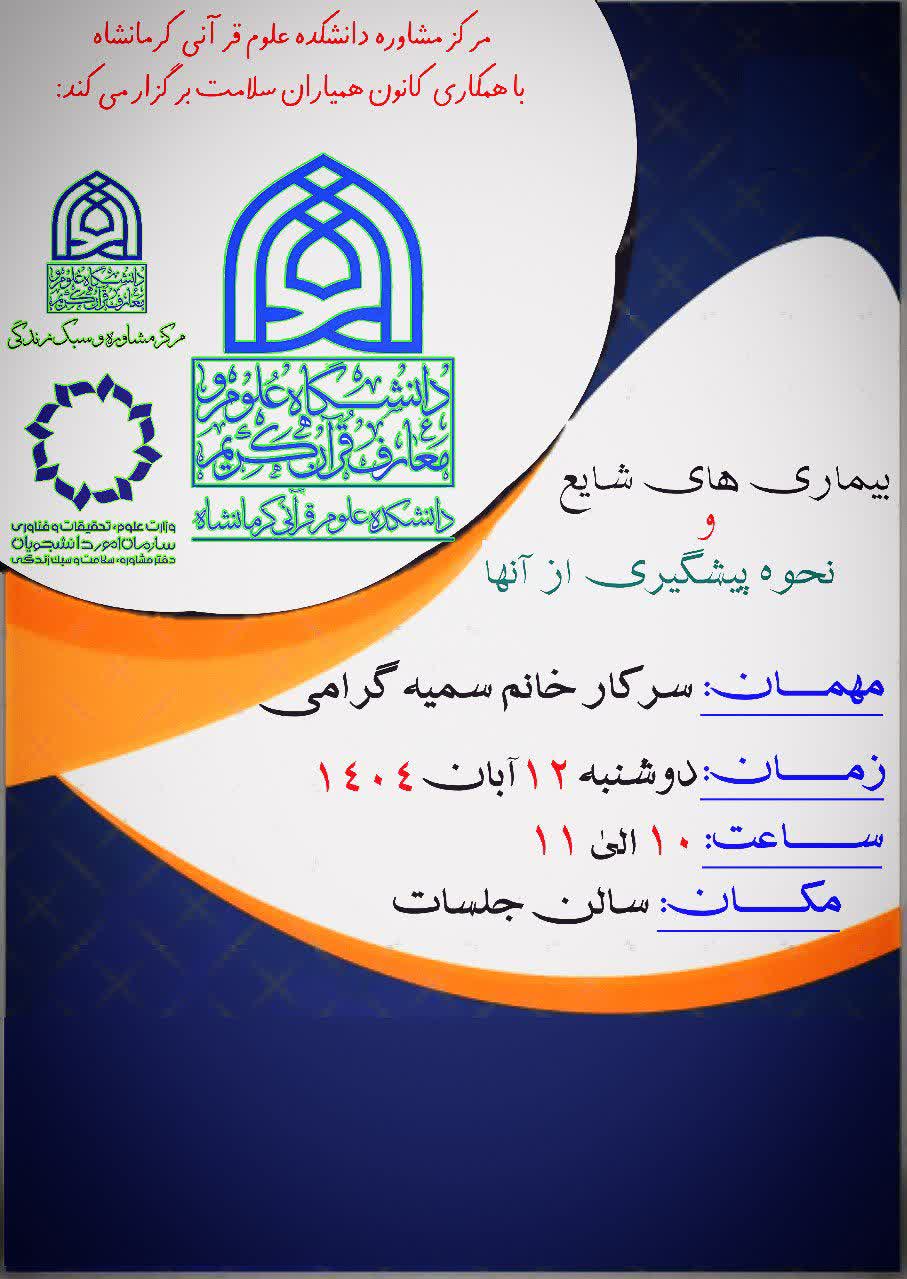 مرکز مشاوره دانشکده علوم قرآنی کرمانشاه با همکاری کانون همیاران سلامت واحد امور دانشجوئی کارگاه آموزشی با عنوان"بیماریهای شایع و نحوه پیشگیری از آنها" را با ارائه سرکار خانم گرامی کارشناس محترم مشاور سلامت به منظور آگاهی بخشی و پیشگیری از بیماریهای شایع را با حضور دانشجویان محترم در سالن جلسات این مرکز برگزار نمود .