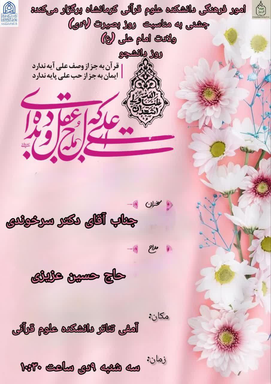 به منـاسبت فـرارسیدن سالـروز میلاد با سعادت امیرالمؤمنین حضرت علی علیه‌السلام ، روز نهم دی ماه روز بصیرت و میثاق امت با ولایت و گرامیداشت روز دانشجو ویژه برنامه جشنی با حضور گرم اساتید، کارکنـان و دانشجویــان عزیز در سالن اجتماعات دانشکده علوم قرآنی کرمانشاه برگزار شد. در آغاز این مراسم، به نیت تبرک و تیمن آیــــاتی چند از کلام نور توسط دکتر محمدصالح رضائی از اساتید دانشکده تلاوت و در ادامه برنامه دکتر چهری ریاست دانشکده ضمن عرض تبریک میلاد با سعادت امام علی ع و روز پدر و همچنین روز بصیرت و گرامیداشت روز دانشجو البته با تأخیر با توجه به اعزام دانشجویان به اردوی فرهنگی زیارتی مشهد مقدس این ایام را تهنیت و به دانشجویان عزیز، اهمیت علم آموزی و راهکارهای کاربردی کردن علم در زندگی را خاطر نشان کردند.