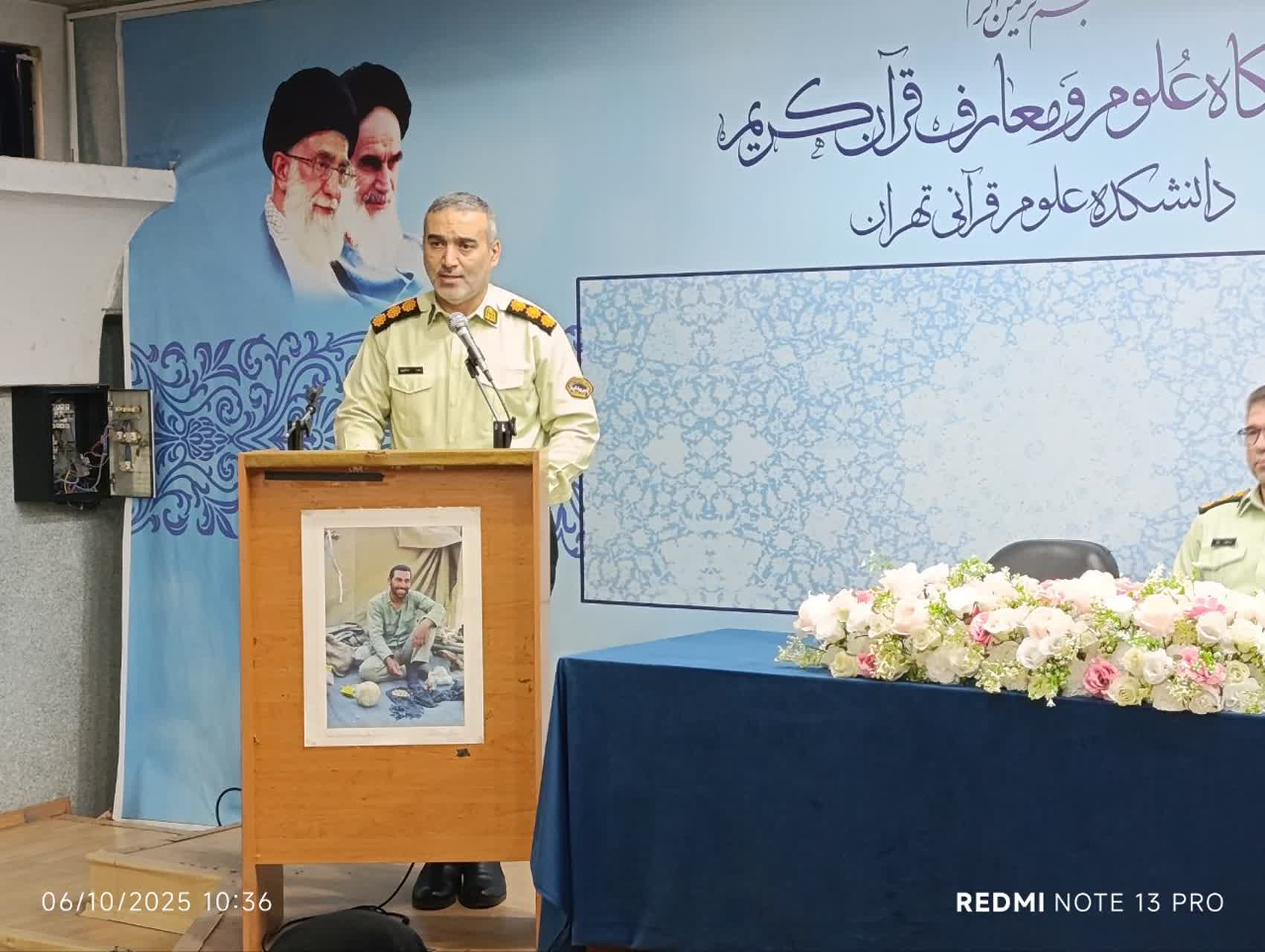 به مناسبت هفته بزرگداشت نیروی انتظامی، با تلاش و پیگیری‌های مدیریت توسعه و منابع دانشکده، سرکار خانم جویا نشست تخصصی ـ فرهنگی با حضور مسئولان محترم نیروی انتظامی جمهوری اسلامی جناب آقایان سرهنگ رضا صادقی‌پور– سرکلانتر هفتم پلیس پیشگیری پایتخت، سرهنگ عبدالوهاب علائی– رئیس کلانتری ۱۰۹ بهارستان و سرکار خانم سرهنگ فاطمه کاظمی– معاون اجتماعی کلانتری ۱۰۹ میدان بهارستان در دانشکده علوم قرآنی تهران برگزار شد. هدف از برگزاری این نشست ارتقای آگاهی اجتماعی، پیشگیری از آسیب‌ها و نیز آشنایی با فرصت‌های جذب در نیروی انتظامی بود. در این برنامه پس از قرائت آیاتی از کلام ا... مجید توسط یکی از دانشجویان، جناب سرهنگ آقای رضا صادقی پور ضمن ابراز خرسندی از حضور در جمع اساتید، کارکنان و دانشجویان به ارائه‌ی گزارشی از فعالیت‌های پلیس در محله پرداختند. سپس جناب سرهنگ عبدالوهاب علائی رئیس محترم کلانتری ۱۰۹ بهارستان، به توضیحاتی پیرامون اقدامات امنیتی و حفاظتی و چگونگی پیشگیری از خطرات، آسیب ها و همچنین حفاظت از جان و اموال افراد پرداختند.در ادامه سرکار خانم دکتر فاطمه کاظم‌زاده ضمن تشکر از حضور مسئولین محترم نیروی انتظامی در دانشکده، سوالاتی در خصوص مسائل امنیتی دانشجویان مطرح کردند که توسط مسئولین محترم پاسخ داده شد. در این نشست صمیمانه آنان به درخواست‌ها و دغدغه‌های دانشجویان گوش سپردند؛ و نکاتی را در رابطه با چگونگی پیشگیری از خطرات احتمالی و مسائل حفاظتی برای حاضرین ارائه نمودند.همچنین، در راستای تعامل سازنده با نسل جوان، پیشنهاداتی برای همکاری و جذب دانشجویان علاقه‌مند به حوزه‌های اطلاعاتی و امنیتی مطرح شد؛ تا پلیس آینده، از دل همین محافل علمی و قرآنی برخیزد. سپس جناب سرهنگ صادقی پور به سوالات دانشجویان در زمینه چگونگی جذب در نیروی انتظامی، نحوه خریدها و پرداخت های اینترنتی، نحوه ی پیشگیری و اقدام در مورد سرقت ها توضیحاتی ارائه نمودند. در پایان این مراسم از مسئولین محترم نیروی انتظامی با اهدای لوح تقدیر و هدیه ای فرهنگی تقدیر به عمل آمد.