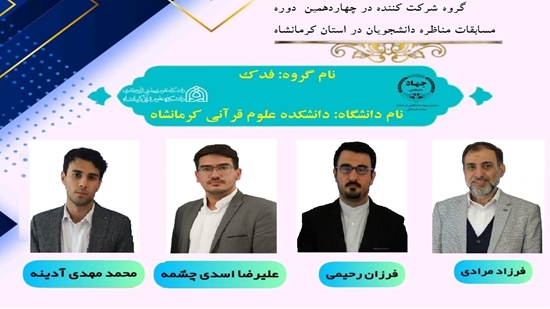 به لطف خداوند متعال تیم فدک دانشجویان دانشکده علوم قرآنی کرمانشاه آقایان: فرزاد مرادی، محمد مهدی آدینه سطری، فرزان رحیمی و علیرضا اسدی چشمه در دومین سال پیاپی است که در این مسابقات مقام برتر استان را کسب می نمایند و موفق به راهیابی به حضور در مرحله کشوری می شوند.